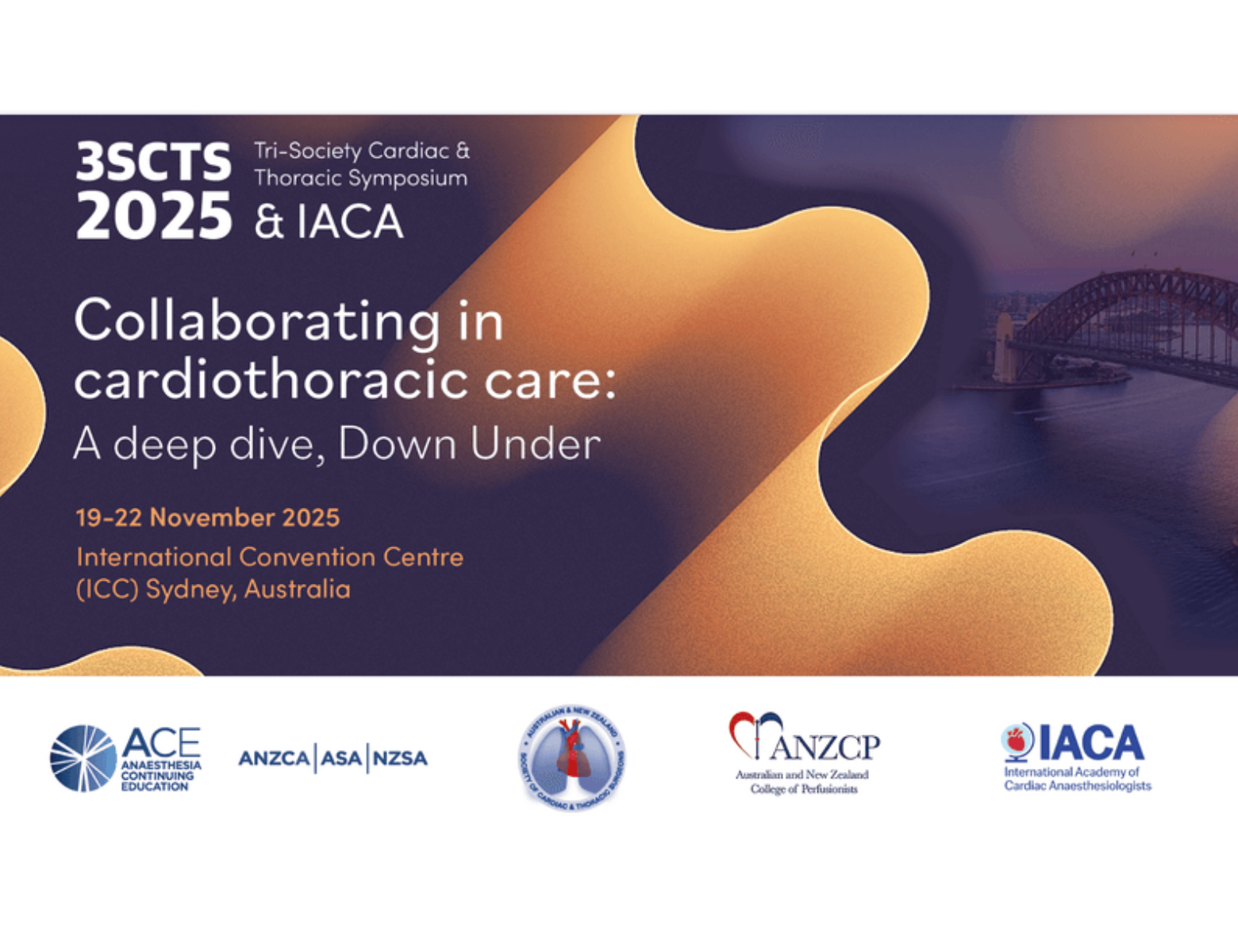 It‘s our great pleasure to invite you to the 2025 Tri-Society Cardiac & Thoracic Symposium (3SCTS) which is a combined scientific meeting of three Australasian cardiothoracic societies: anaesthesia (ANZCA), surgery (ANZCTS), and perfusion (ANZCP). This will be the second 3SCTS meeting with the theme of “Collaborating in cardiothoracic care: A deep dive, downunder”. It will be held at the Sydney International Convention Centre (ICC), Australia from 19-22 November 2025.